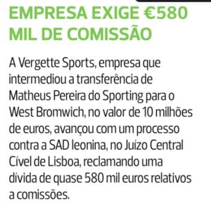 A Bola say that Vergette Sports have ‘advanced with a lawsuit’ in the Central Civil Court against Sporting for the figure of €580,000 related to commissions from Pereira’s move to the Hawthorns.